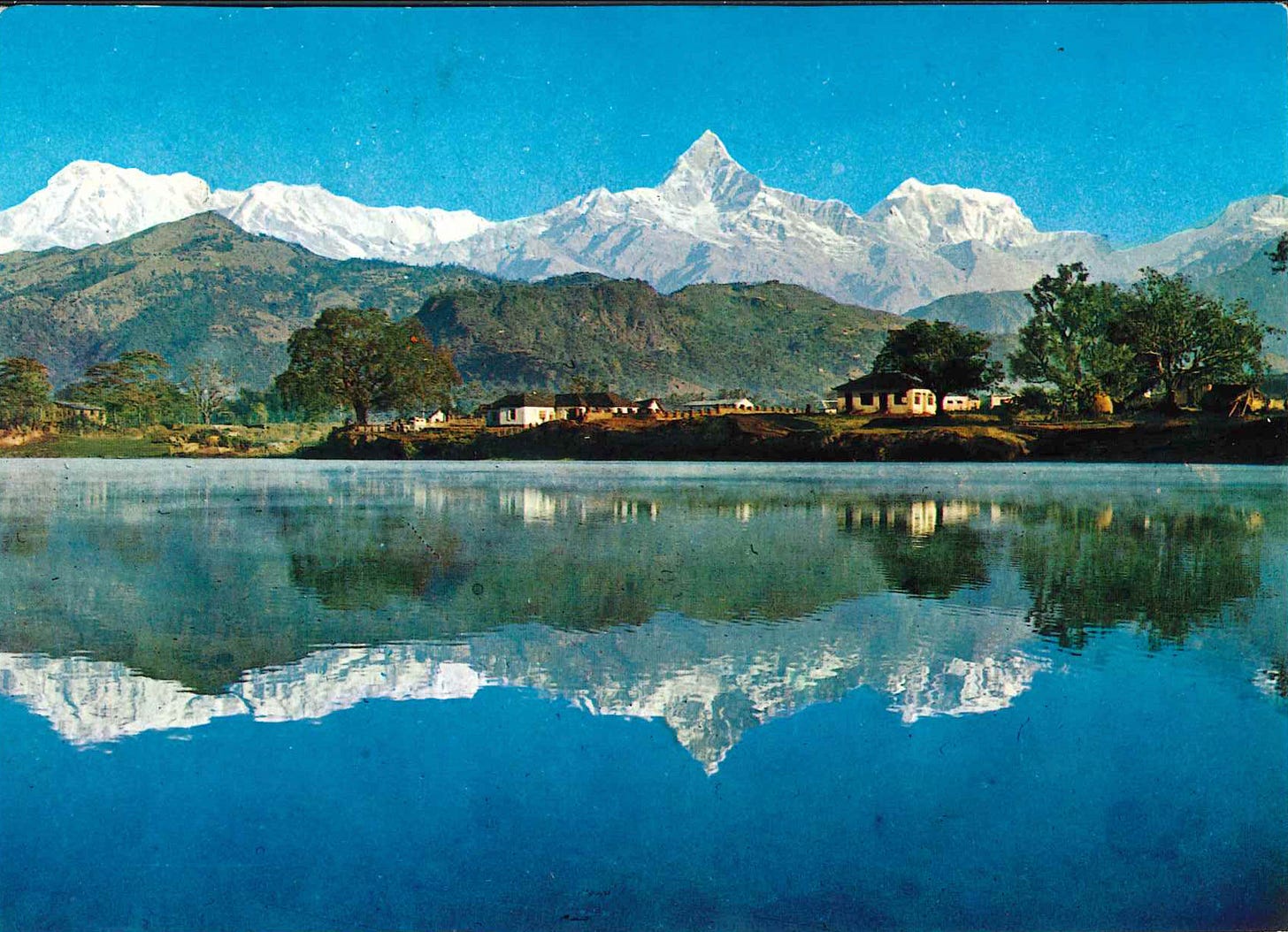 When I searched for the place—Pokhara, Nepal—I found the following photograph of Phewa Lake on Wikipedia, which looks, well, literally identical to the picture postcard (and according to its caption, it was taken in 1982):