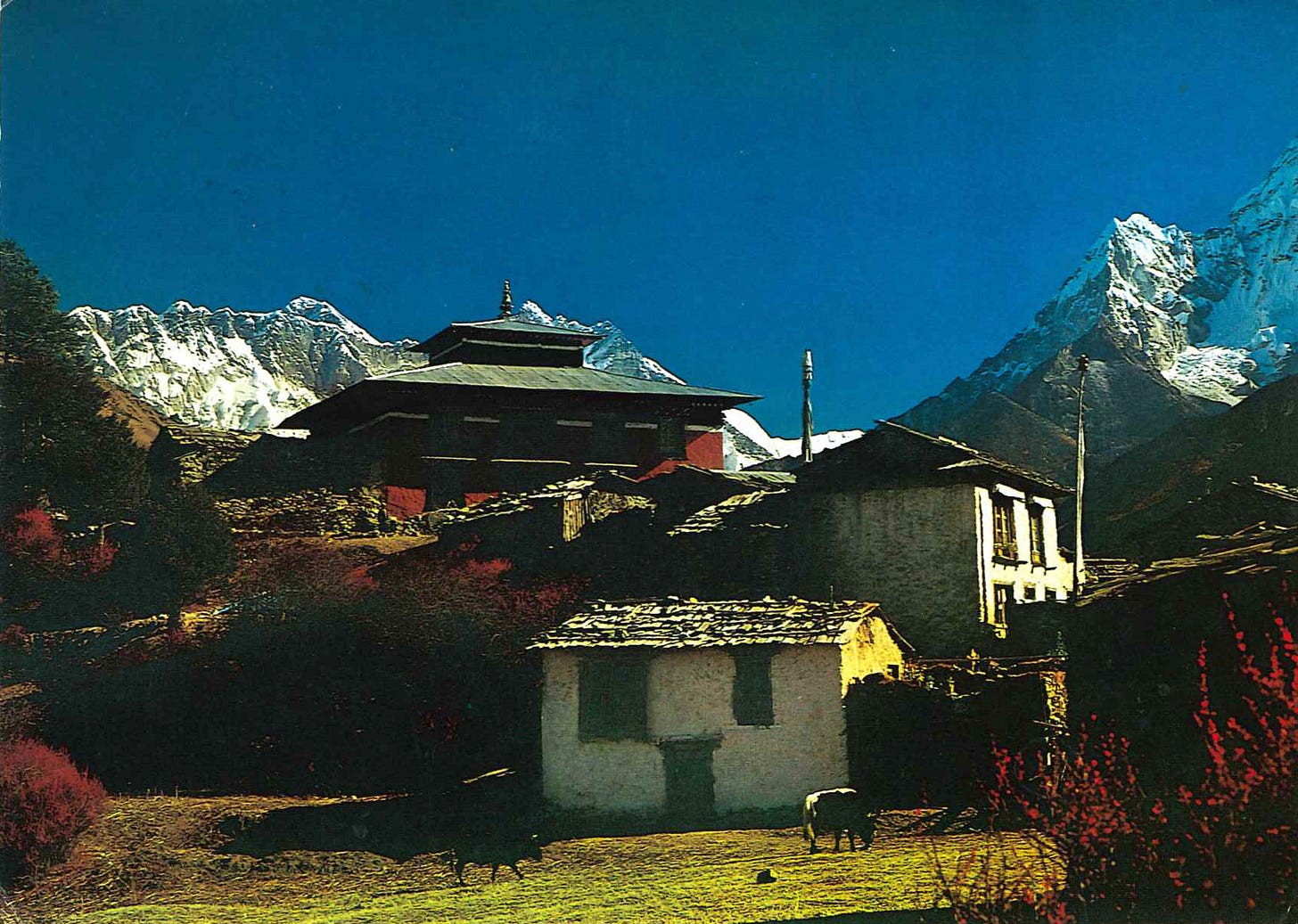 Finally, the Tengboche Monastery, also sent in 1984, is shown in front of Mt. Nuptse, Everest (behind), Lhotse, and Ama Dablan, as the caption on its reverse indicates: